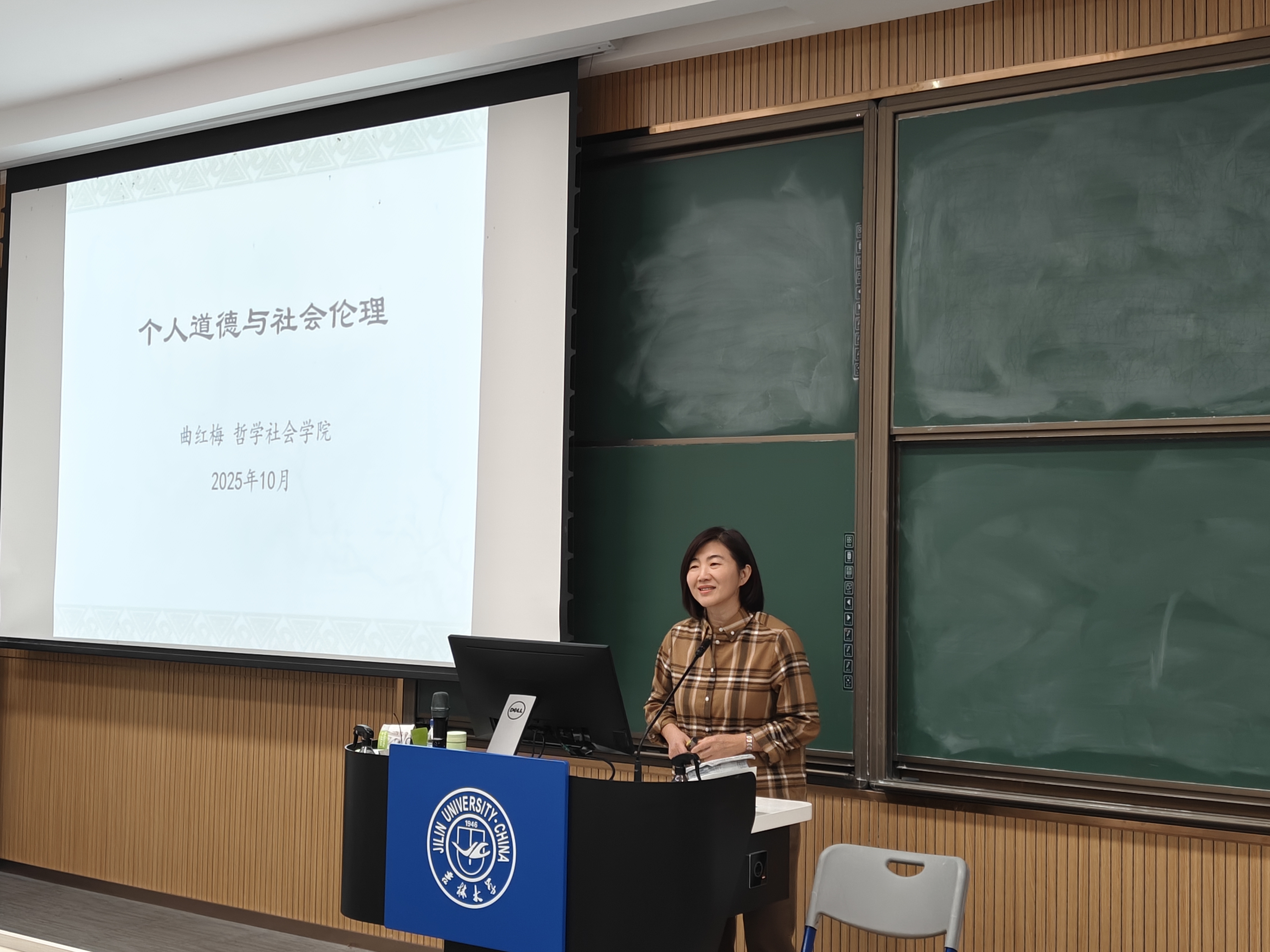 10月20日晚,“女性学课堂”公选课在李四光楼102教室开启第五讲。本场题为《个体道德与社会伦理》的讲座,邀请吉林大学社会科学研究院院长、哲学社会学院哲学系曲红梅教授主讲。讲座由妇委会副主任崔妍主持。