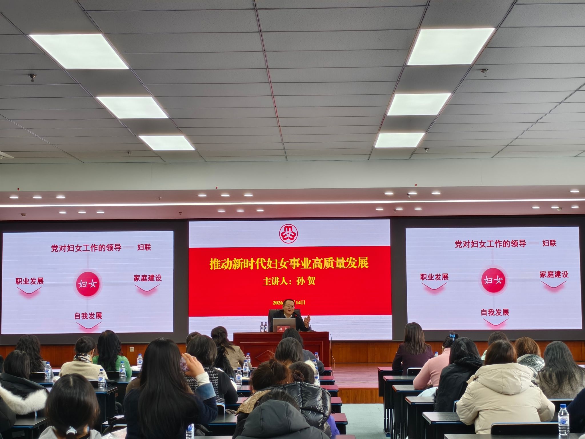 为深入解读党的二十届四中全会精神,妇委会特邀马克思主义学院教授、博士生导师,本科生院教学研究办公室主任孙贺老师,作《推动新时代妇女事业高质量发展》专题辅导讲座。孙老师围绕 “妇女事业是党的事业重要组成部分”“妇女解放与职业化发展”“妇女是家庭主心骨”“妇女关爱与全面发展” 四大核心展开讲解。讲座紧扣全会精神,兼具理论高度与实践深度,为大家把握新时代妇女事业发展新要求、新使命提供有力指引,引发强烈共鸣。讲座在热烈掌声中圆满结束。