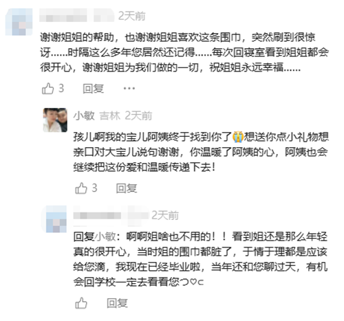 “谢谢姐姐的帮助,也谢谢姐姐喜欢这条围巾,突然刷到很惊讶……时隔这么多年您居然还记得……每次回寝室看到姐姐都会很开心,谢谢姐姐为我们做的一切,祝姐姐永远幸福……”