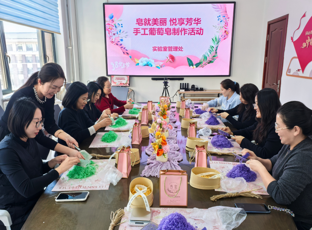 春意盎然,芳华绽放。为庆祝第116个“三八”国际妇女节,进一步关心关爱女教职工,丰富精神文化生活,舒缓工作压力,凝聚团队向心力,实验室管理处于3月6日下午举办“皂就美丽 悦享芳华”手工葡萄皂制作活动,全处女教职工欢聚一堂,共庆佳节。